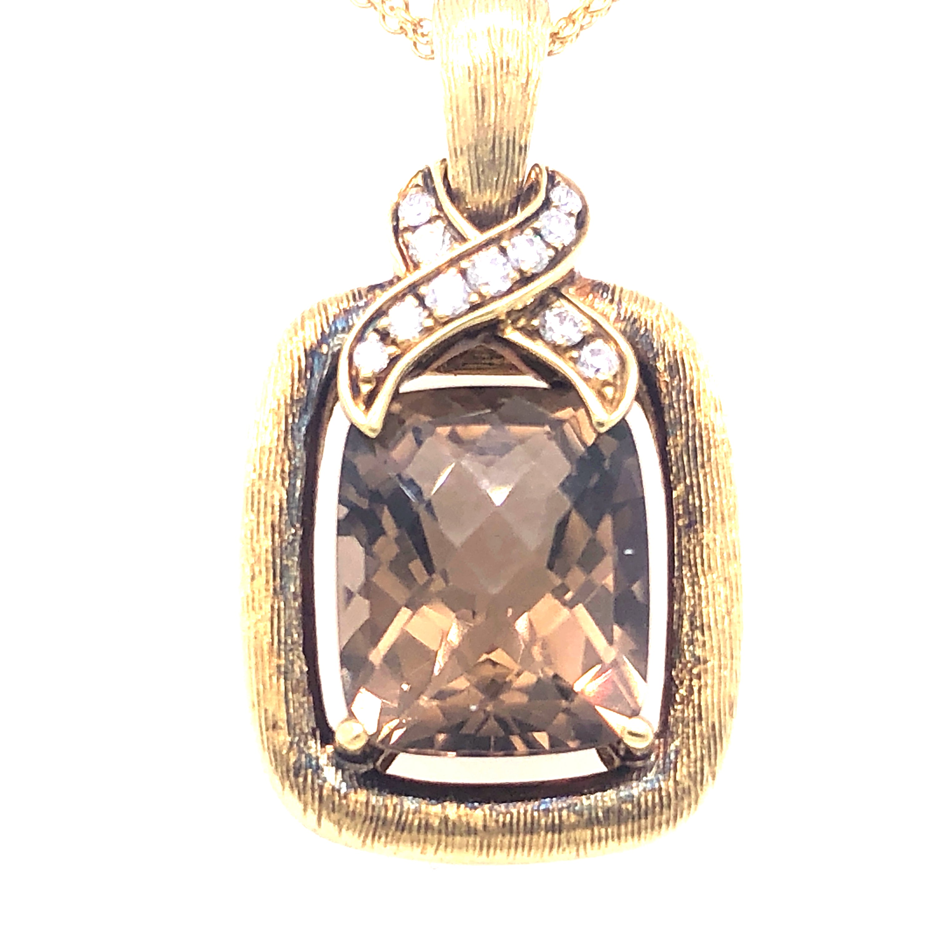 18 karat yellow gold capri 4.63 carat rectangle smokey quarts with 11 diamonds totaling 0.13 in carat weight on a 2 - strand chain.