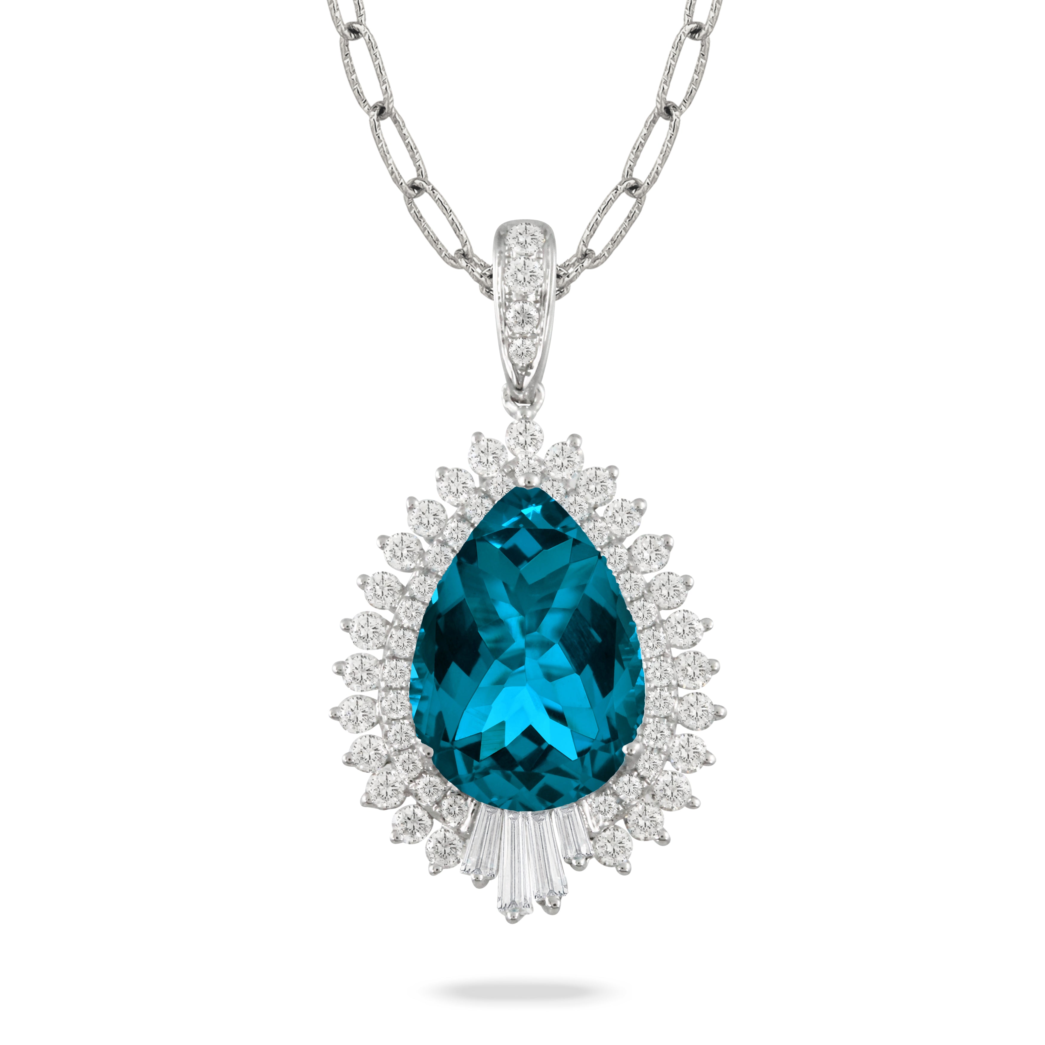 18 Karat White Gold 0.95ctw Diamond and 5.81ct London Blue Topaz Pendant and 18 Karat White Gold Textured Oval (2 x 5 mm) Links Fancy Doves Chain 18"