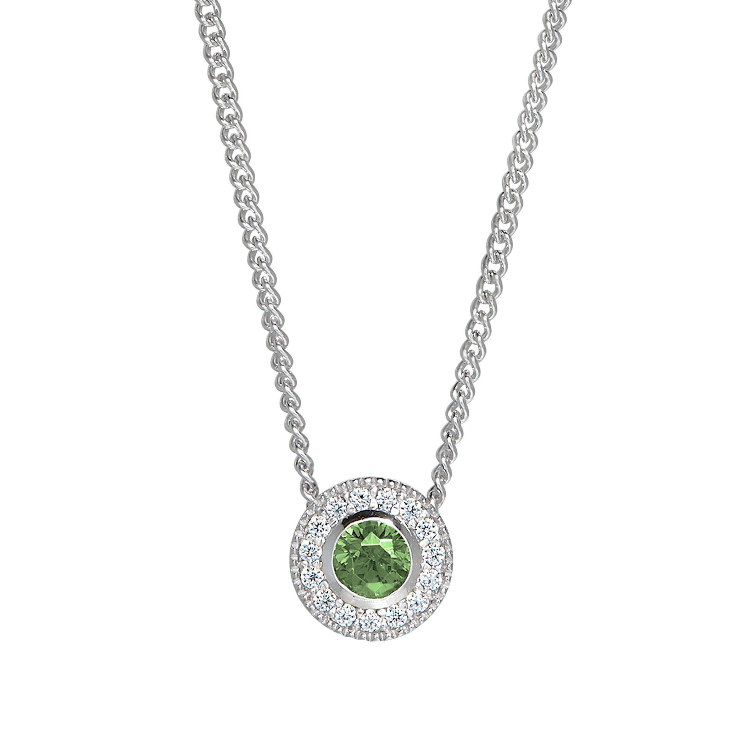 Sterling silver platinum finish round simulated peridot birth gem pendant with simulated diamonds on 18" curb chain.