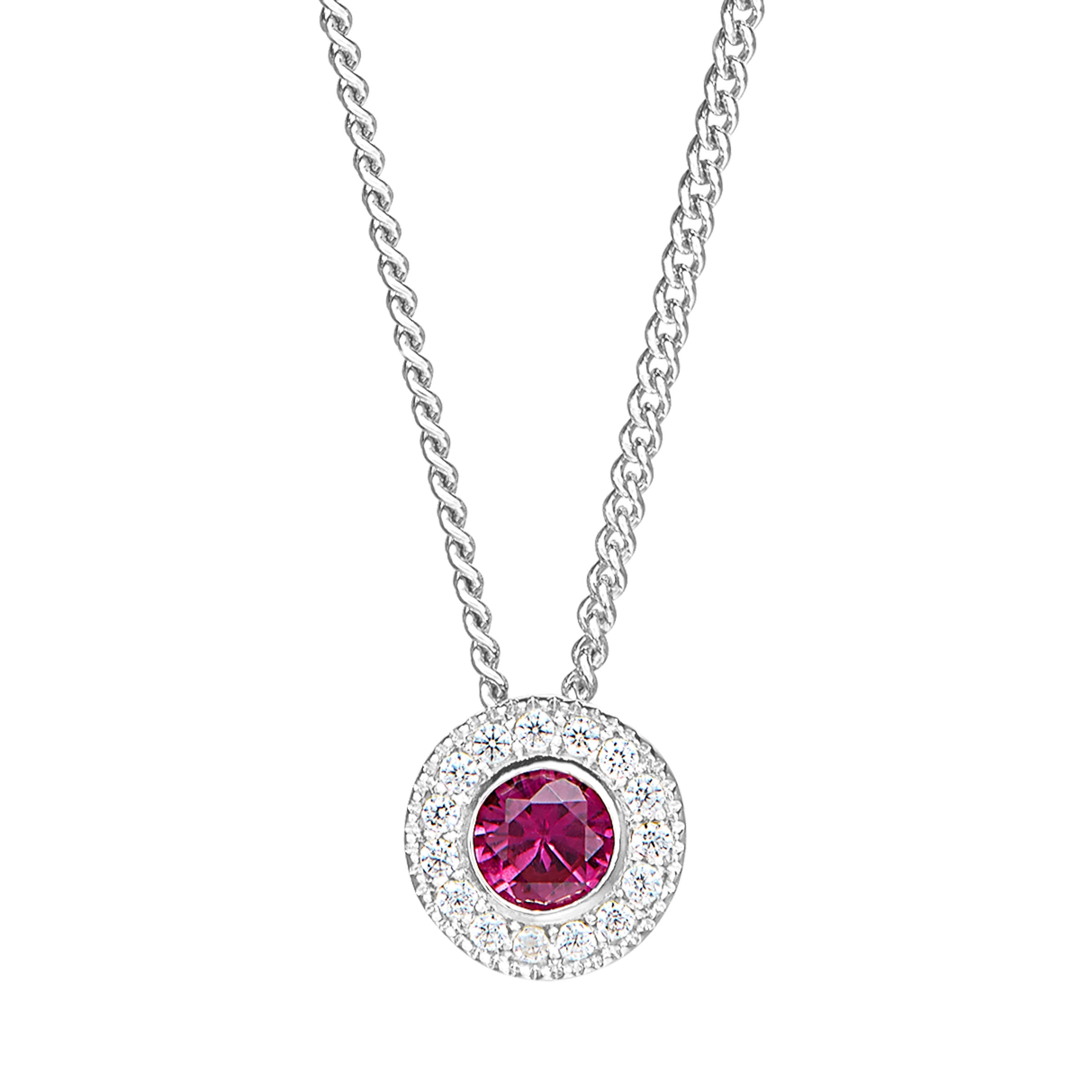 Sterling silver platinum finish round simulated ruby birth gem pendant with simulated diamonds on 18" curb chain.