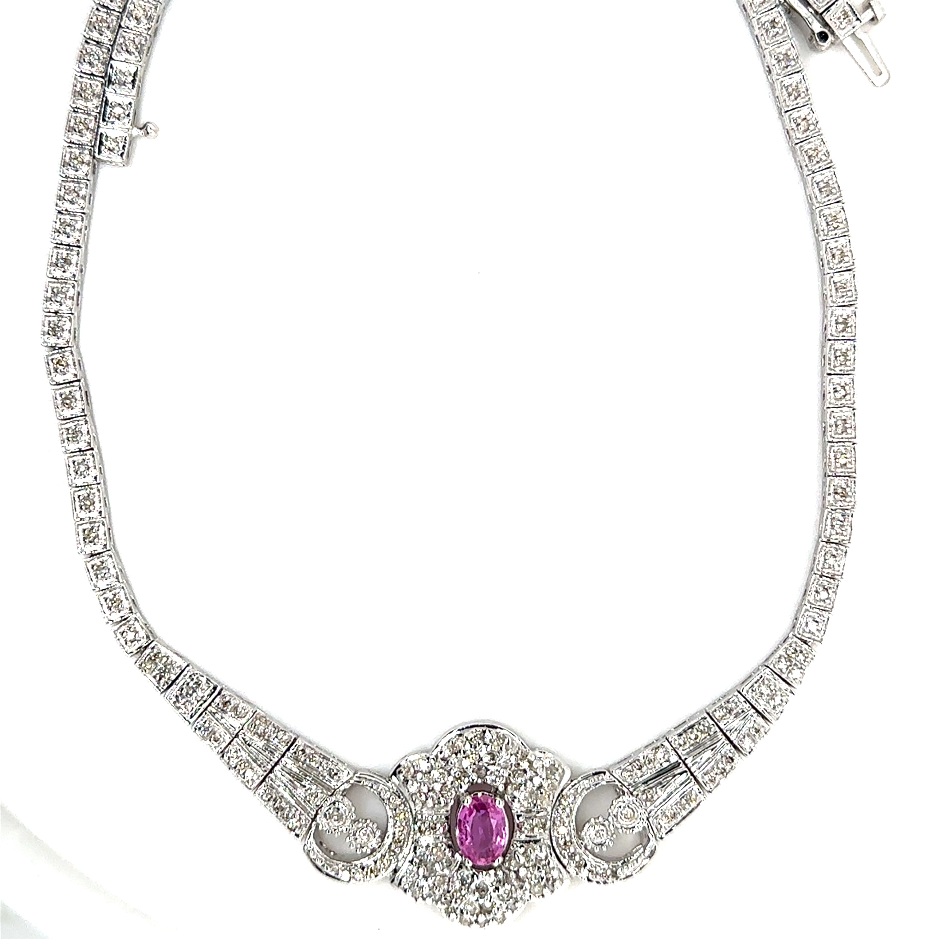 ESTATE JEWELRY: 14KT White Gold approx. 2.00ctw diamonds & approx. 1.10ct oval pink sapphire measuring 7.15 x 5.1 x 3.00mm Necklace. Diamonds: Commercial Grade Gold: 24.6dwt Estate Jewelry Disclaimer : Please note that all estate jewelry pieces are previously owned and sold as-is. Due to the nature of vintage and antique items, normal signs of wear and age are to be expected. While we make every effort to accurately describe each item, including gemstone specifications, metal content, and overall condition, all information is provided to the best of our knowledge. approximates, and should not be considered a guarantee. We do not guarantee the authenticity of designer marks, gemstone treatments, or exact grading unless accompanied by a third-party certification. By purchasing estate jewelry, the buyer acknowledges and accepts that: Items are sold without warranties or guarantees, either expressed or implied. The store is not liable for any damages, loss, or dissatisfaction resulting from the purchase, use, or resale of estate jewelry. All sales are considered final unless otherwise specified in writing at the time of purchase.