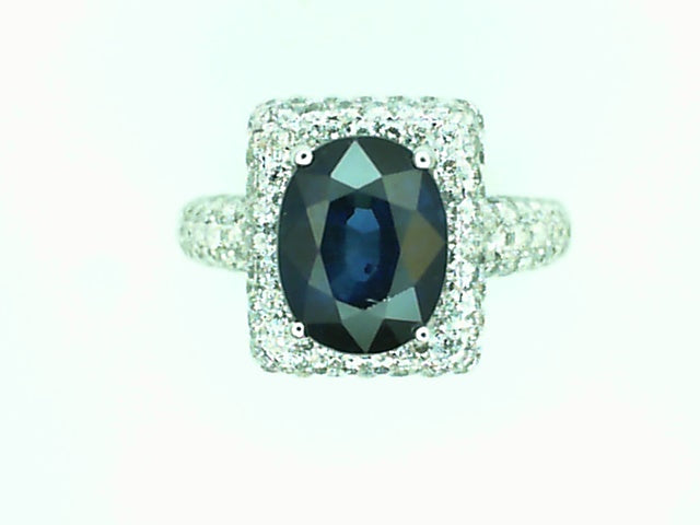 14 Karat white gold Sapphire and diamond ring. The center oval shape Sapphire weighs 2.99 carats. There are pave set diamonds weigh approximately 1.398 carats.