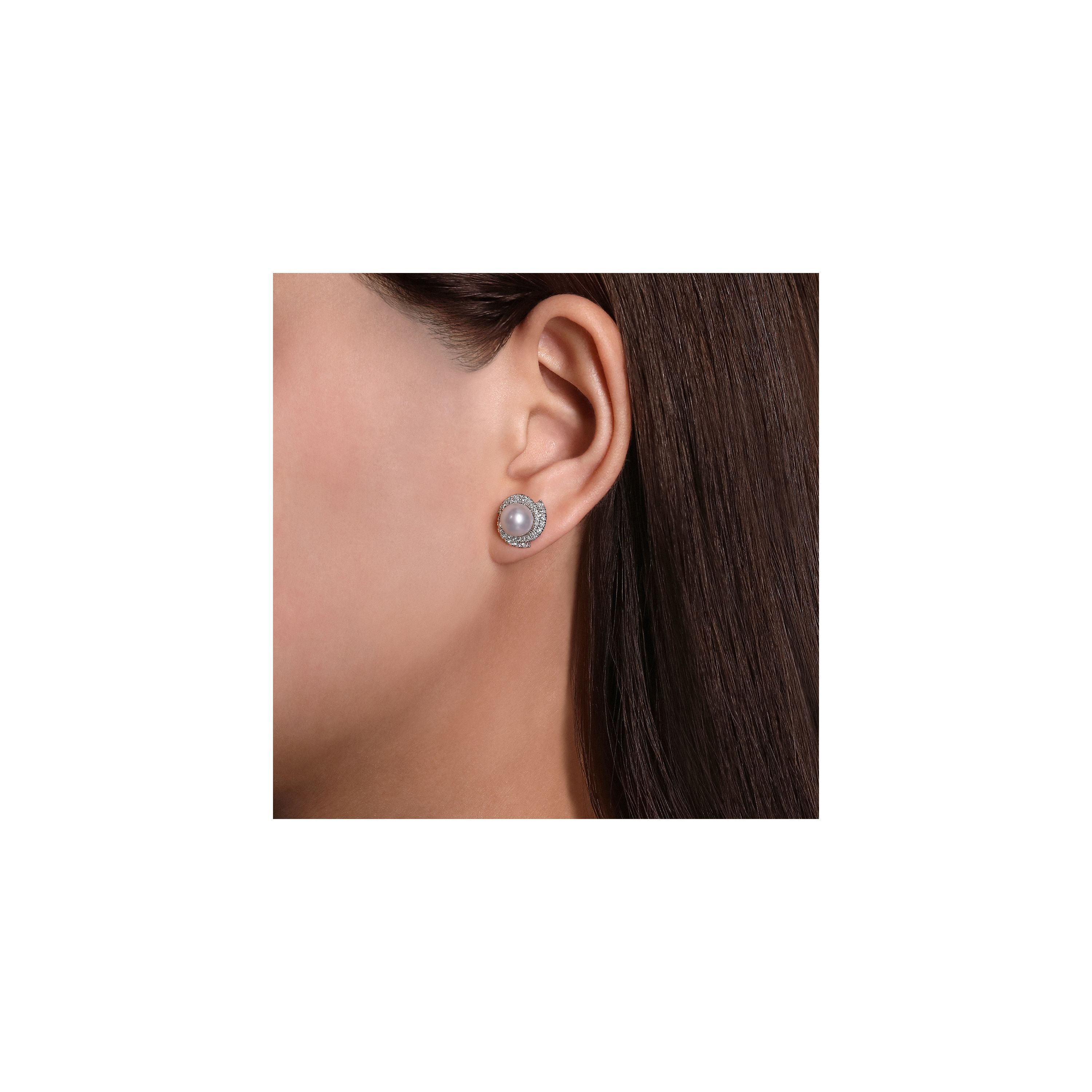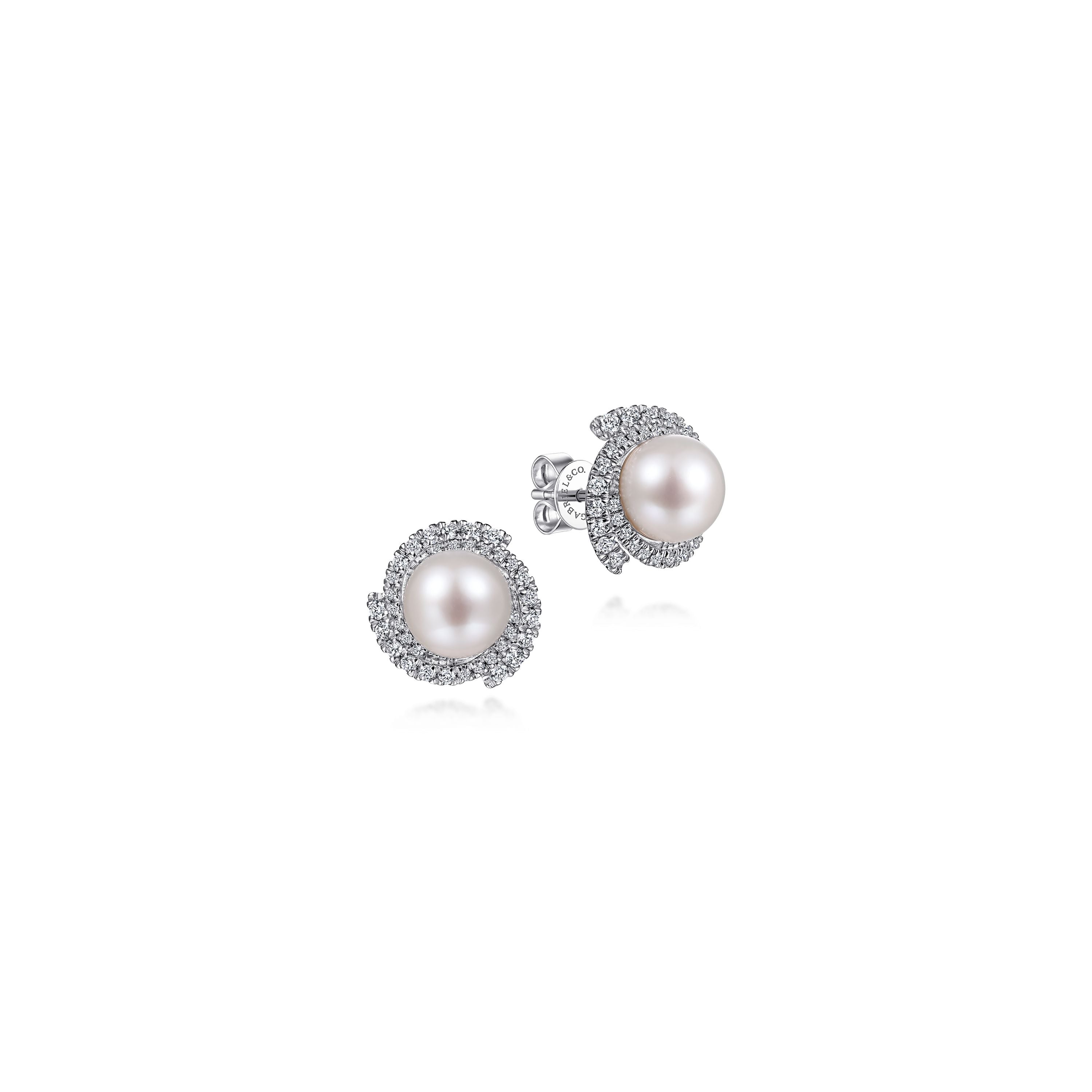 14K White Gold Round Cultured Pearl Swirling Diamond Halo Stud Earrings "Grace Collection" Fresh Water Pearl 1.48 Faint Color/SI2 or higher 0.65 Serial No. S1105853