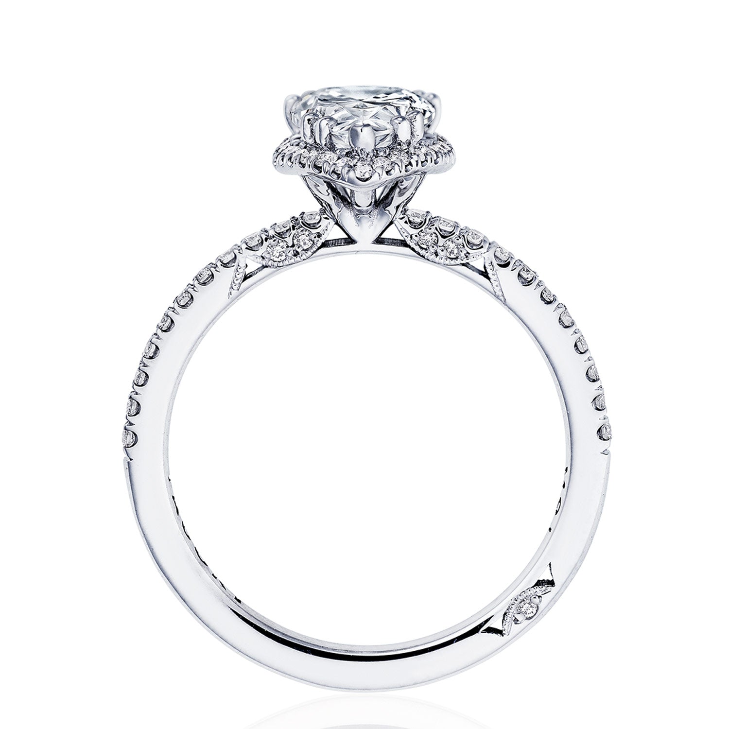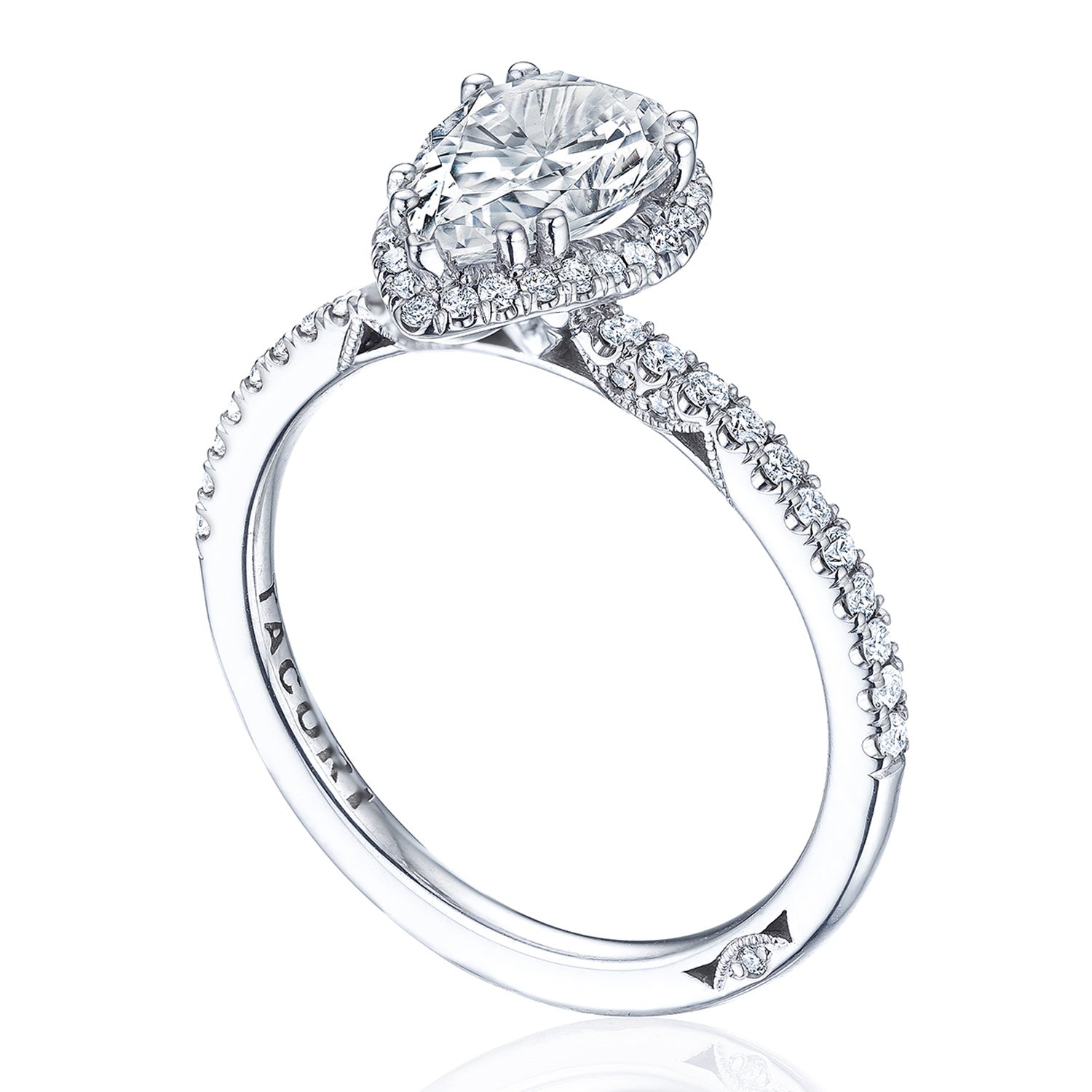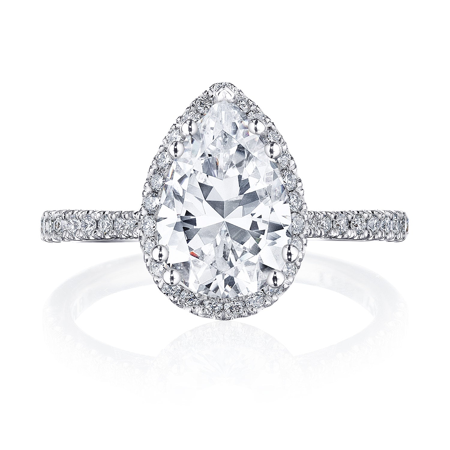 18 Karat White Gold 0.30 ctw Tacori Pear Prong Set Halo Pave Semi- Mount Engagement Ring Size 6.5. Serial No. 555349 Vendor ID: 159/Vendor Style #: 2676 1.5 PS 8x5 W