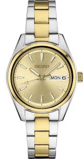 Ladies two tone Seiko watch with gold tone dial. day date. SUR354