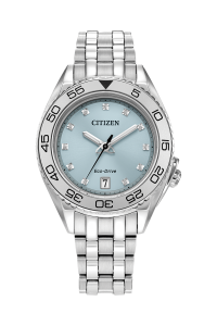 Ladies EcoDrive Stainless Bracelet Watch with Light Blue Dial-Diamond Accents and Date MODEL FE6161-54L 1/11/2023 MOVEMENT TECHNOLOGY J810 Eco-Drive Ring Powered by any light source, continuously and sustainably, eliminating the need to replace watch batteries. CASE WIDTH (MM) 35 LUG WIDTH (MM) 16 BAND TYPE Bracelet Stainless Steel CASE MATERIAL Silver-Tone Stainless Steel CRYSTAL Sapphire Crystal Superior scratch resistance and hardness CLASP Deployment Clasp with Push Buttons DIAL Light Blue WATER-RESISTANCE WR100/10Bar/333ft [Swimming, Showering & Snorkeling] ADDITIONAL FUNCTIONS 3 Hand