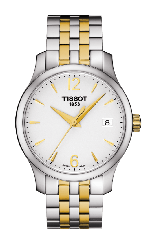 Tissot 'Tradition' Ladies' Watch. Stainless Steel, Round 33Mm Case, 7.3Mm Thick. Silver Face With Date And Markers, Sapphire Crystal, Water Resistant, Two-Tone Bracelet 182 / T063.210.22.037.00