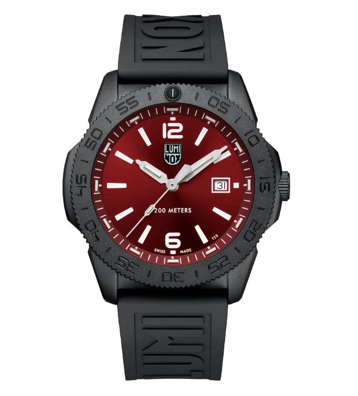 LUMINOX: Pacific Diver Red Dial Black CTF Strap Dive Watch, 44 mm Bold color meets rugged performance in this versatile dive watch built for life above and below the surface. The Pacific Diver 3120 Series features a 44mm IP black stainless steel case with a CARBONOX™ unidirectional bezel, delivering durability without the weight. A powerful crimson red sunray dial offers a vibrant, high-contrast display that’s as eye-catching as it is functional. Equipped with Luminox Light Technology for a constant glow in low light and total darkness, this watch is always ready when you are. The versatile black cut-to-fit strap can be cut to any desired length and is designed to fit all wrist sizes. With 200 meters of water resistance, a screw-down crown, and a sapphire crystal with anti-reflective coating, the Pacific Diver is a trusted companion whether you're diving into the ocean or heading into your day.