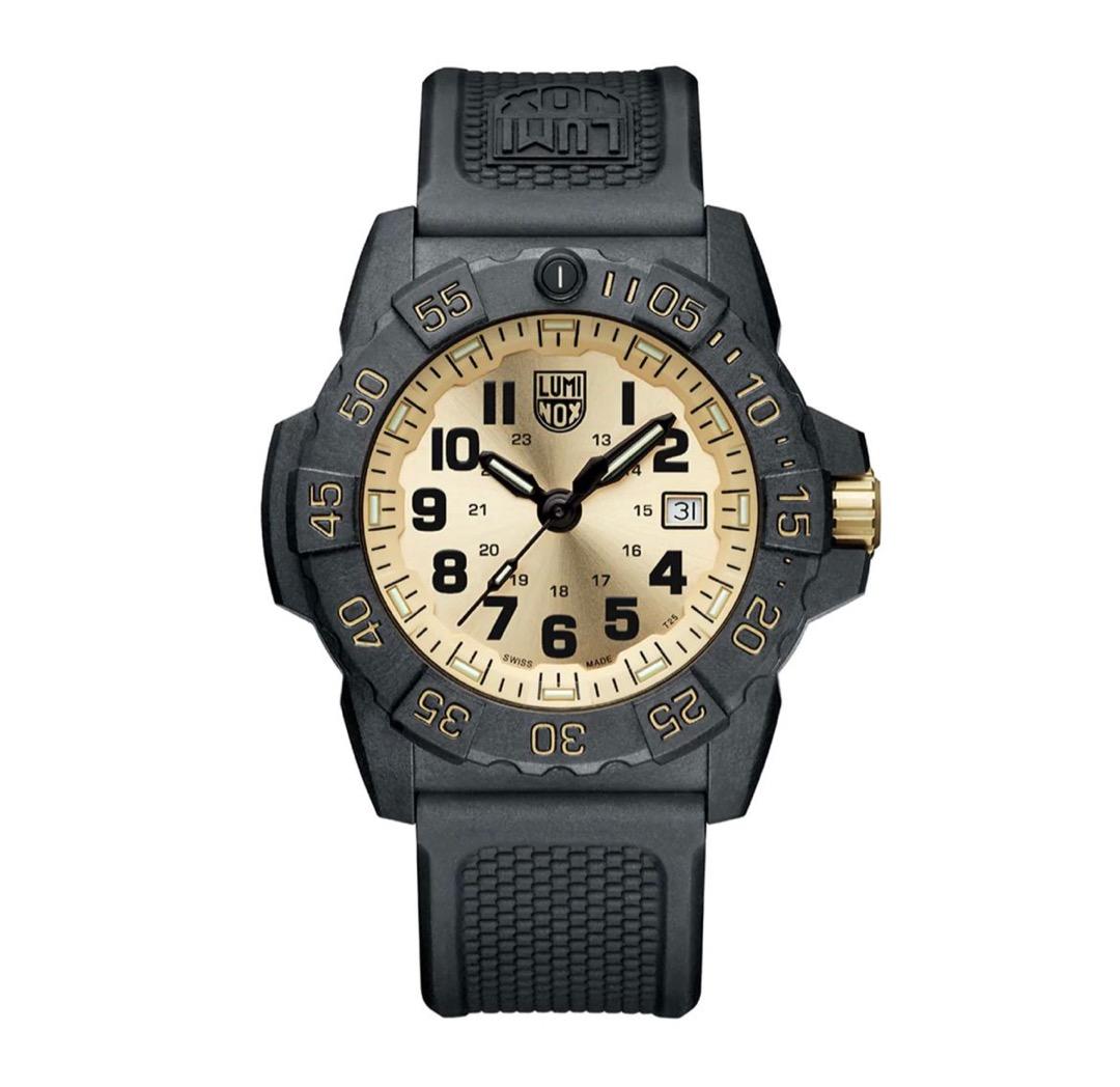 Luminox Navy Seal 3500 Series Limited Edition (#879 of 1200) -Reference : XS.3505.GP.SET -Collection : Navy SEAL GOLD Limited Edition -Movement : Swiss Quartz -Case size : 45mm -Dial color : Gold Color -Case material : Stainless Steel -Strap type : Black Nitrile Rubber -Crystal : Hardened Mineral Crystal -Lug width : 24mm -Water Resistance : 200M/20ATM -Screw Down Crown : Yes