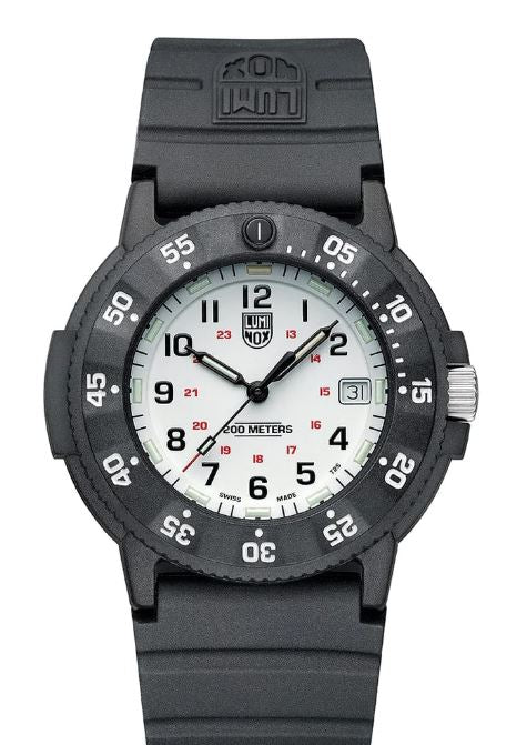 MEN'S LUMINOX 3000 EVO SERIES ORIGINAL NAVY SEA, 45MM MILITARY WATCH CARBONOX UNI-DIRECTIONAL ROTATING WATER-RESISTANT TO 200 METERS AND POWERED BY A SWISS MADE QUARTZ MOVEMENT, THE LUMINOUS TUBES ARE ON EACH OF THE HOUR MARKERS, AND ON THE UNIDIRECTIONAL TURNING BEZEL, SO YOU WILL ALWAYS BE ABLE TO SEE THE TIME.