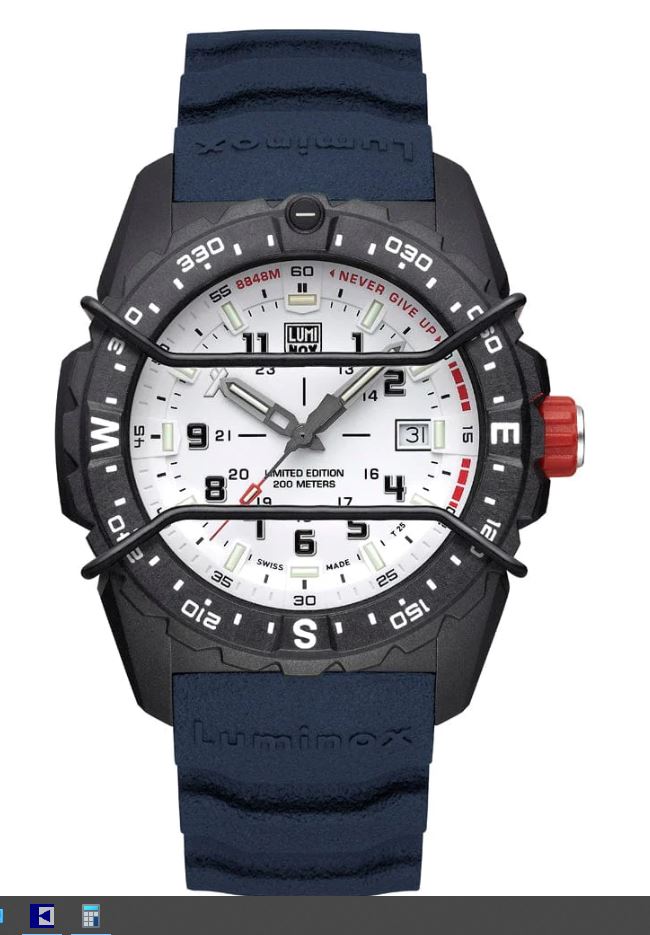 MEN'S LUMINOX BEAR GRYLLS SURVIVAL MOUNTAIN COLLECTION, 43 MM - LIMITED EDITION. SWISS QUARTZ, RONDA 515, HH6, TIME DATE, CARBONOX™ BI-DIRECTIONAL ROTATING BEZE. THE LIMITED EDITION BEAR GRYLLS MOUNTAIN WATCH CELEBRATES THE 25TH ANNIVERSARY OF BEAR GRYLLS EPIC FEAT, CLIMBING THE HIGHEST MOUNTAIN ON EARTH, MOUNT EVEREST. LIMITED TO 800 PIECES WORLDWIDE, THIS SPECIAL TIMEPIECE BOASTS A STRIKING WHITE DIAL, DEEP BLUE STRAP, AND A RED CROWN TO MATCH THE COLORS OF THE NEPALESE FLAG, HOME TO THE MOUNTAIN. THE CASE BACK IS DECORATED WITH MOUNT EVEREST IN RELIEF AND THE OUTER RING IS MARKED WITH “8848M” – THE ALTITUDE OF MT EVEREST. THE WATCH HAS A 43MM CARBONOX™ CASE AND UNI-DIRECTIONAL BEZEL, MARKED WITH CARDINAL POINTS ALONGSIDE A SAPPHIRE CRYSTAL FACE ITH ANTI-REFLECTIVE COATING AND LUMINOX LIGHT TECHNOLOGY FOR INCREASED READABILITY IN ANY LIGHT CONDITIONS. THE BEAR GRYLLS’ LIMITED EDITION INCLUDES A REMOVABLE BULL BAR, DESIGNED TO FURTHER PROTECT THE CRYSTAL, PERFECT FOR THE RUGGED ADVENTURER.