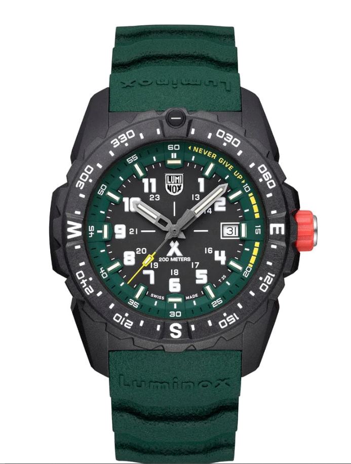 MEN'S,LUMINOX BEAR GRYLLS SURVIVAL MOUNTAIN, DARK GREEN, 43 MM WATCH. THIS BEAR GRYLLS MOUNTAIN SERIES WATCH FEATURES A 43MM VERY LIGHTWEIGHT CARBONOX™ CASE AND UNI-DIRECTIONAL BEZEL, MARKED WITH CARDINAL POINTS, ALONGSIDE A SAPPHIRE CRYSTAL FACE WITH ANTI-REFLECTIVE COATING FOR INCREASED READABILITY. BEAR GRYLLS SIGNATURE IS ENGRAVED ON THE CASE BACK AND HIS FAMOUS MOTTO ‘NEVER GIVE UP’ IS INSCRIBED AROUND THE EDGE OF THE DIAL. THE SIGNATURE BEAR GRYLLS SCREW-IN ORANGE CROWN, DARK GREEN DIAL OUTER RING AND DARK GREEN INTEGRATED RUBBER STRAP, CREATE UNIQUE DESIGN DETAILS SWISS QUARTZ, RONDA 515, HH6, TIME DATE