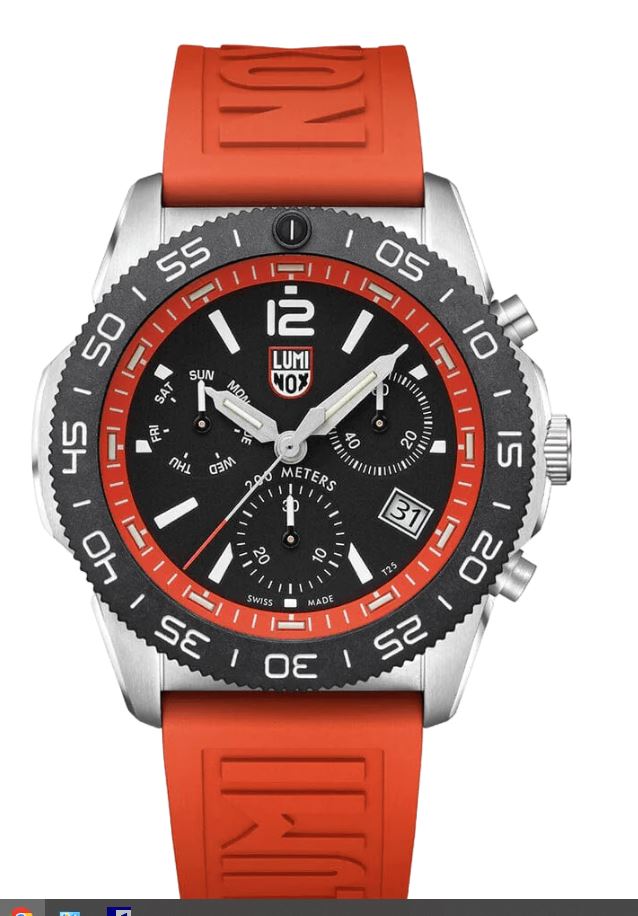 MEN'S LUMINOX PACIFIC DIVER CHRONOGRAPH DIVE WATCH, 44 MM. SAPPHIRE CRYSTAL, ANTI-REFLECTIVE COATING, CHRONOGRAPH DATE THE PACIFIC DIVER CHRONOGRAPH BOASTS A 44MM STAINLESS STEEL CASE WITH A CARBONOX™ UNIDIRECTIONAL BEZEL, A VITAL INSTRUMENT FOR ANY DIVER. A BLACK DIAL FEATURES WHITE NUMERALS AND INDICIES FOR EASY READING WITH A STRIKING ORANGE DIAL RING. A MATCHING ORANGE CUT-TO-FIT RUBBER STRAP COMES ON THE WATCH. AS WITH EVERY OTHER LUMINOX TIMEPIECE, THIS PACIFIC DIVER INCORPORATES LUMINOX LIGHT TECHNOLOGY,