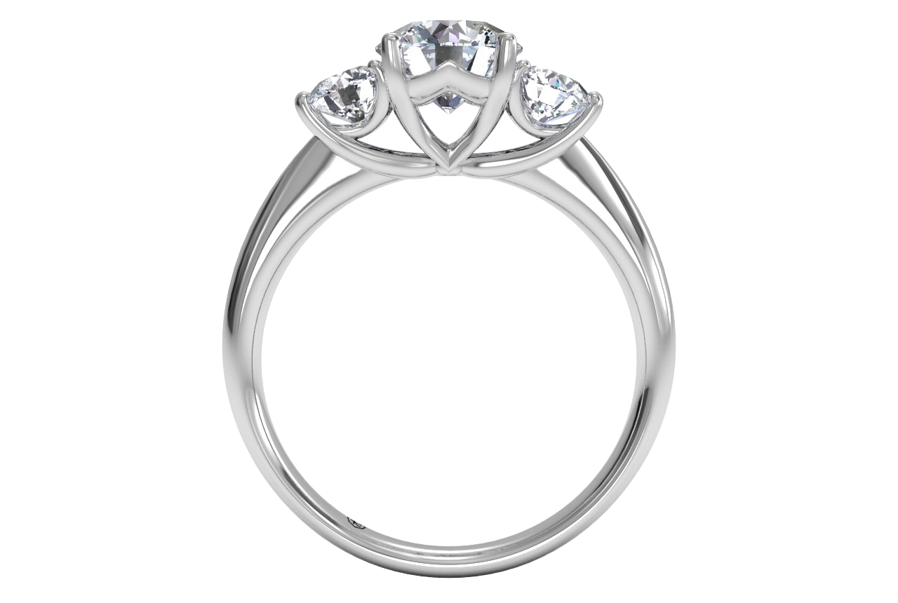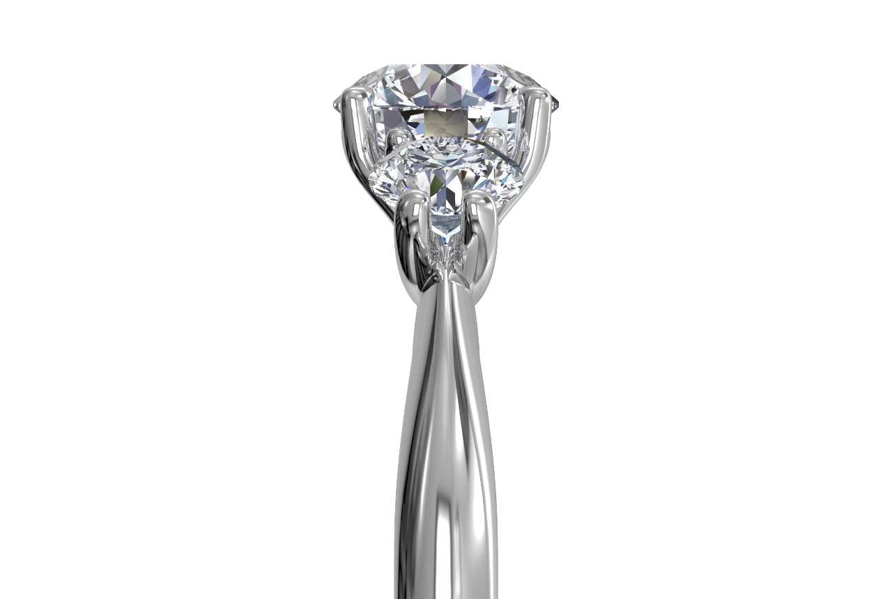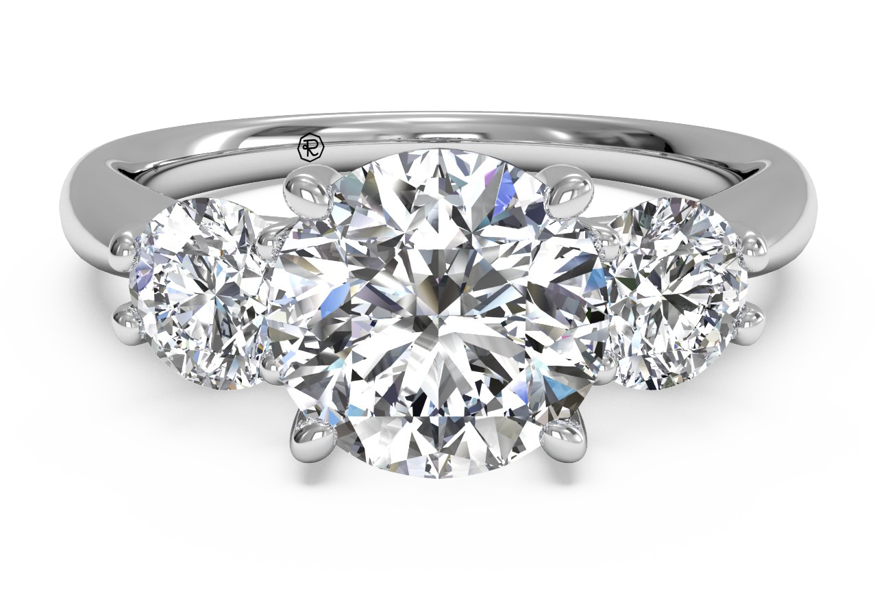 RITANI Three-Stone Diamond Engagement Ring in 18 Karat White Gold and 0.50 carat TW Round cut diamonds, finger size 6.5 Center stone sold separately. Cast in gleaming 18kt white gold, this three-stone diamond engagement ring is a stylistic twist on a classic silhouette. Featuring a round cut center stone, this ring also has round side diamonds for added brilliance. The rhodium-plated solid 18kt gold band tapers once it reaches the side diamonds, to further emphasize the diamonds’ sparkle. A raised Royal Crown setting provides dramatic detail, resembling the points of a crown when viewed from the side. Collection: Classic Metal type: 18kt White Gold Metal weight: 3.34 grams Band width: 2.4 mm Available ring sizes: 3.0 - 9.0 Recommended diamond shapes: Princess, Round Recommended center stone weight: 0.15 - 25.00 carats Sidestone Minimum Total Carat Weight: 0.50 Sidestone Minimum Color: H Sidestone Minimum Clarity: VS2 Manufactured in New York, USA