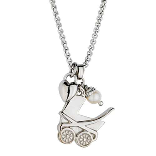 S Silver baby carriage pendant with puffed heart and white pearls on an 18" box chain. 120/38125