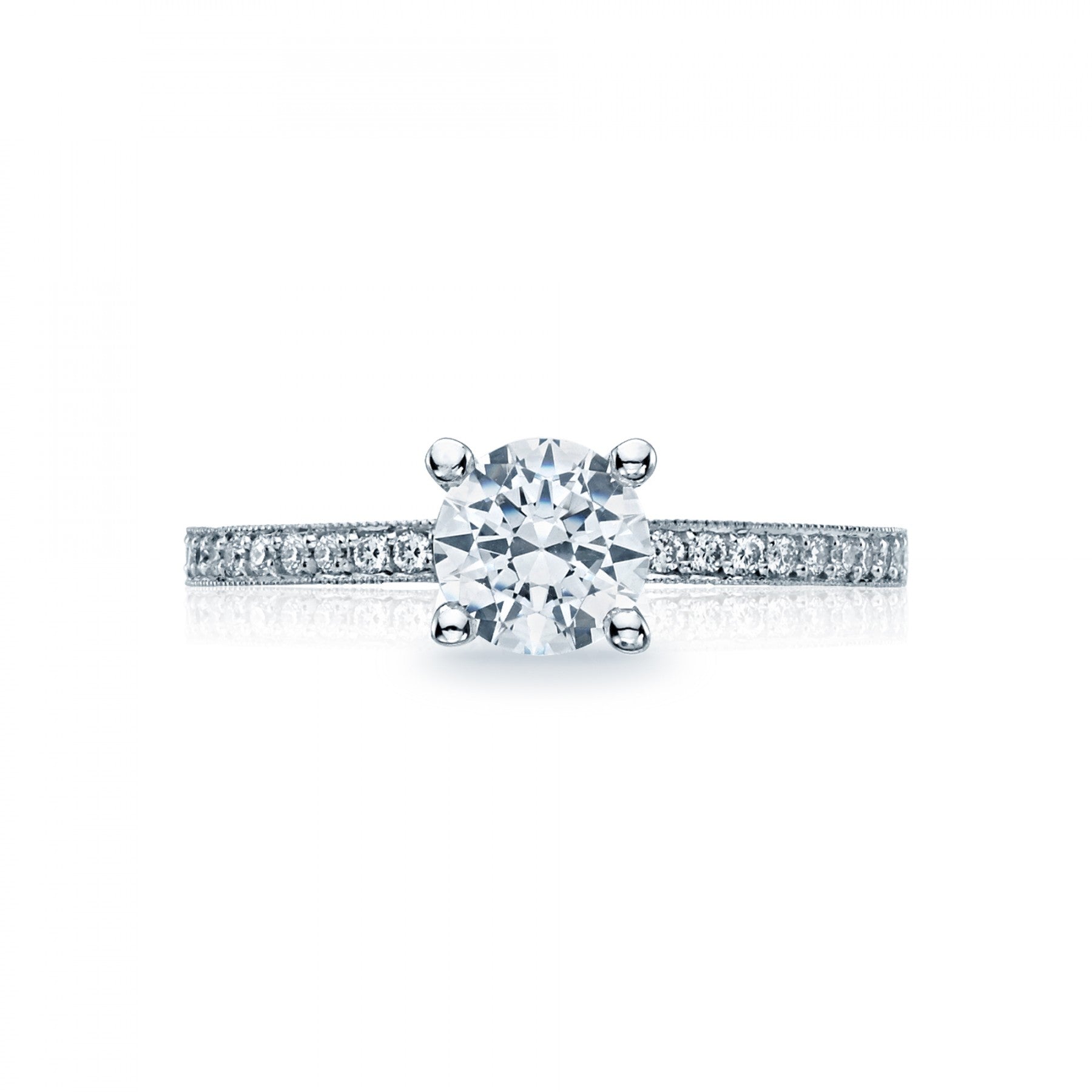 TACORI White Gold and Diamond Engagement Ring. A single stream of round, channel set diamonds ignites a radiant center diamond for sophisticated simplicity. Classic prong-set engagment ring. This engagement ring can accommodate a variety of center diamond sizes, starting at 0.50 carats, available by special order. This engagement ring can accommodate Princess, Round diamond shapes, available by special order. Total carats in engagement ring as pictured (not including center diamond) equal approximately 0.16. Metal Shown: 18 karat white gold Available in Platinum, as well as 18K White, Yellow and Rose Gold Centerstone sold separately