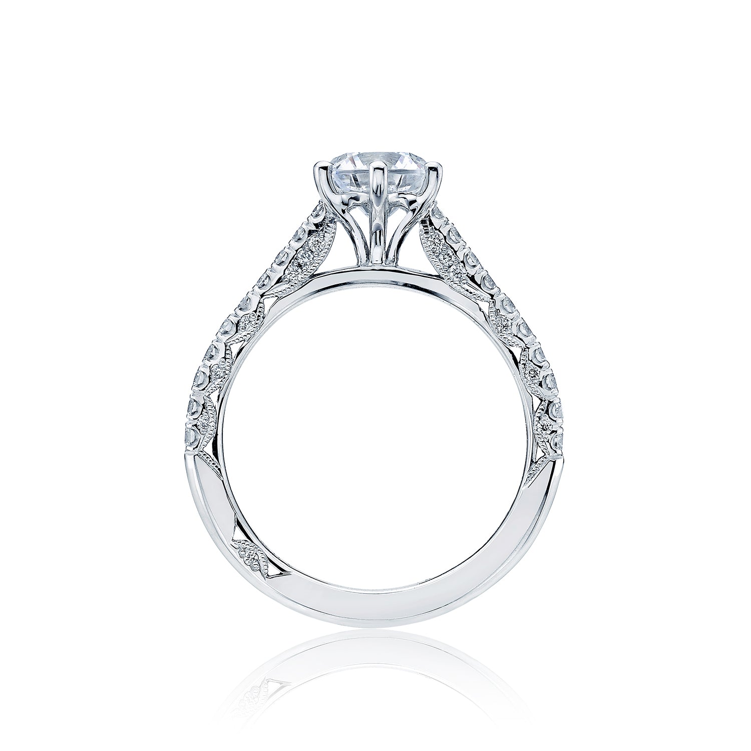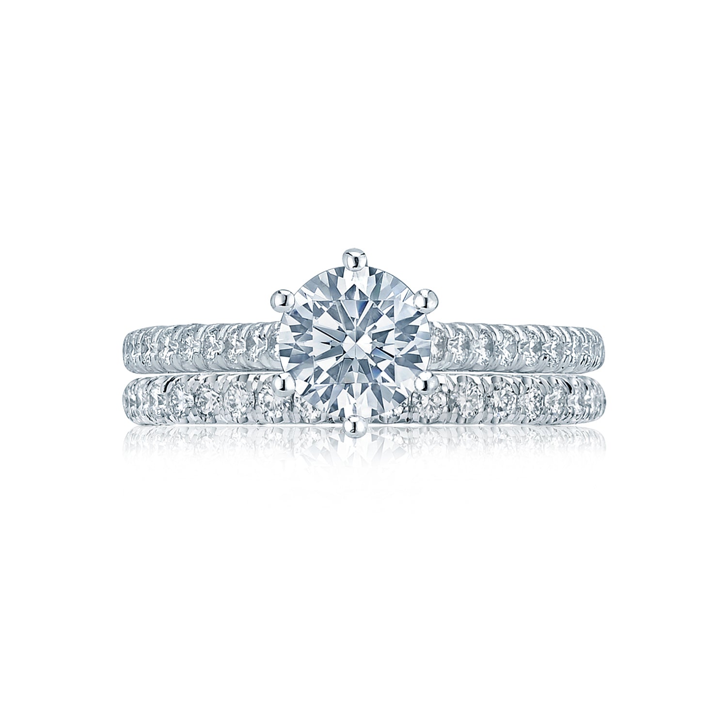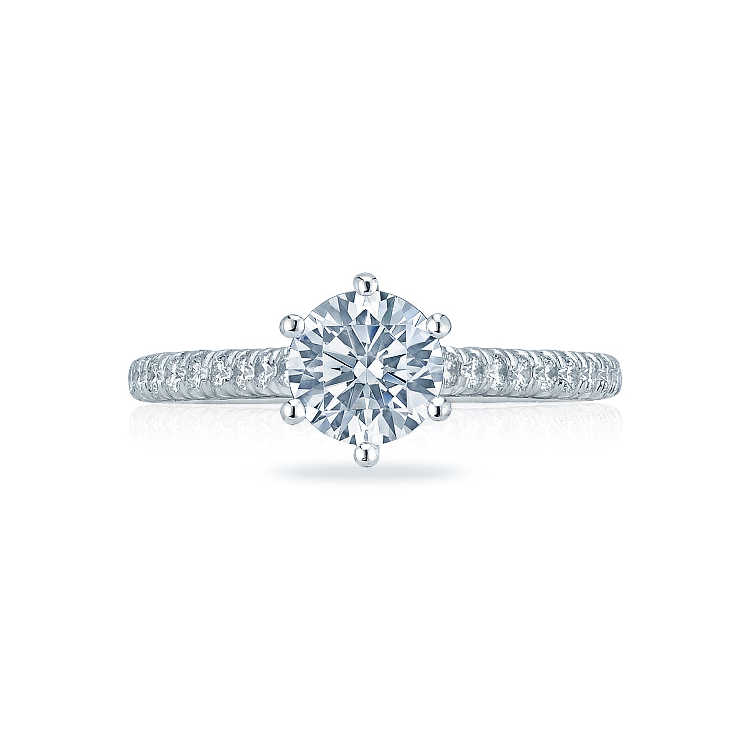 TACORI White Gold and Diamonds Engagement Ring This ring is perfect for the Tacori Girl who is looking for the bigger diamond look. A brilliant round center diamond sits gently on a pavé set string of diamonds for an elegant and dainty look.\ This engagement ring can accommodate a variety of center diamond sizes, starting at 0.75 carats, available by special order. This engagement ring can accommodate Princess, Round diamond shapes, available by special order. Total carats in engagement ring as pictured (not including center diamond) equal approximately 0.43. Metal Shown: 18 karat white gold Available in Platinum, as well as 18k White, Yellow and Rose Gold